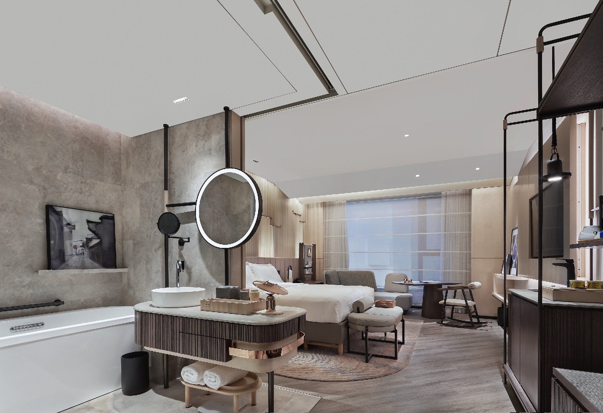 酒店裝修設(shè)計(jì)公司案例:空間定位為套房服務(wù)式公寓,旨在為金融圈商旅人士打造高性?xún)r(jià)比的服務(wù)式居所。