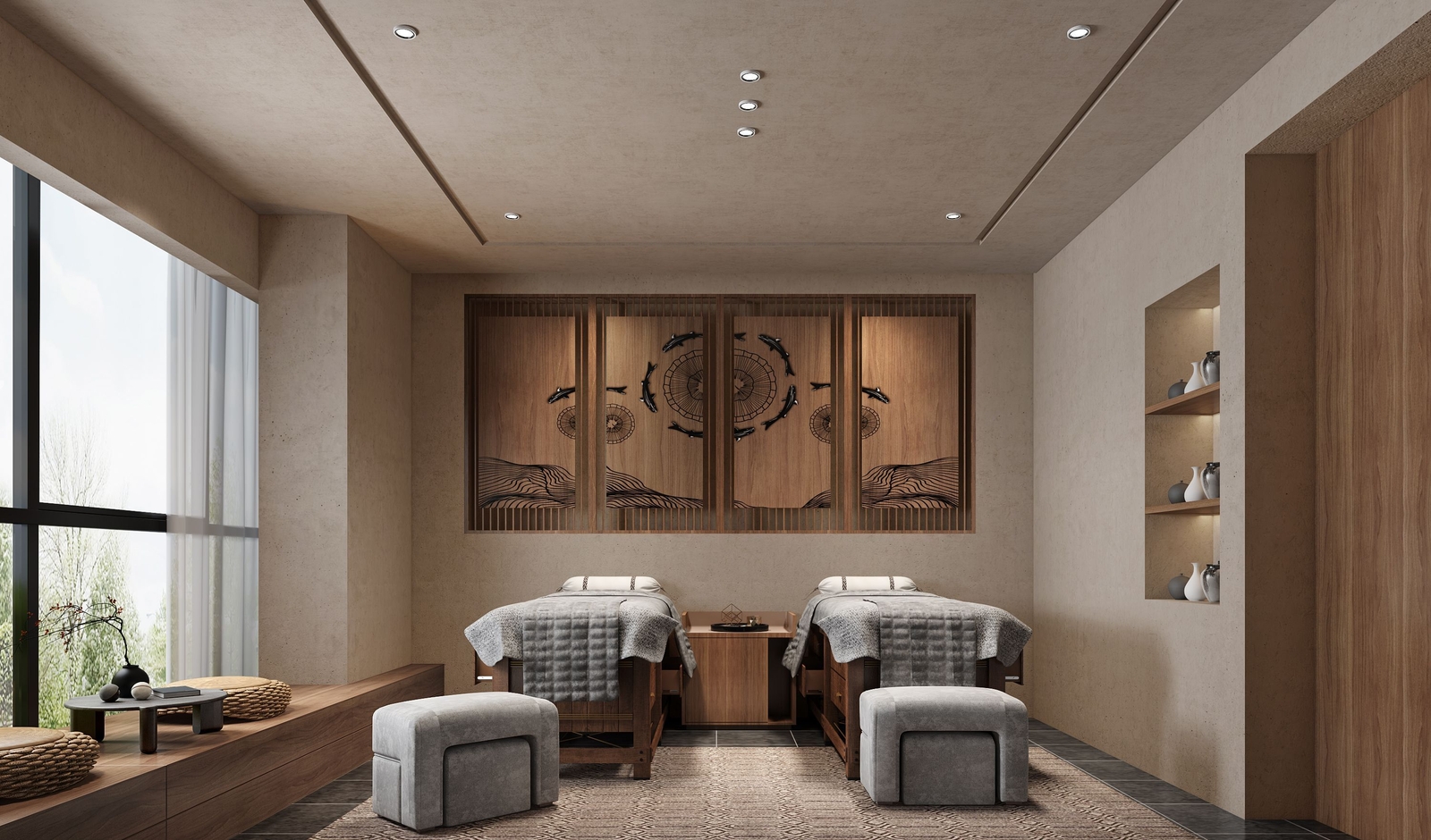 4. 地面材料:選擇易清潔、防滑的地面材料,如瓷磚或地板。足浴區(qū)可以選用具有按摩效果的特殊地板材料,以增加足部舒適感。