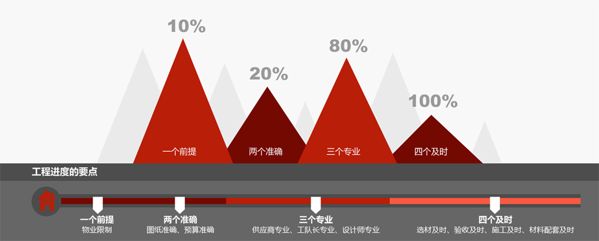 “四個(gè)及時(shí)”中,最容易被忽略的兩點(diǎn)是選材與驗(yàn)收。我們認(rèn)為要把工地井井有條的按計(jì)劃執(zhí)行客戶(hù)應(yīng)該在“選材及時(shí)”中給我們以配合。這個(gè)要求,可能覺(jué)得大多數(shù)的裝修公司是不會(huì)跟客戶(hù)說(shuō)的,可能出于為了簽單方便的原因,也可能出于內(nèi)部管理松散。舉例來(lái)說(shuō)明,泥工進(jìn)場(chǎng)時(shí),若地面