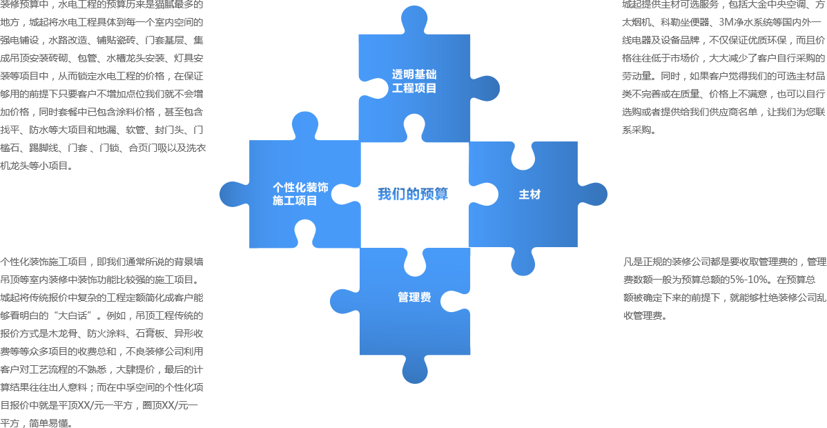 的傳統(tǒng)預(yù)算報價精細(xì)劃分為透明基礎(chǔ)工程項目、主材、個性化裝飾施工項目、管理費(fèi)四大方面, 每個方面的預(yù)算都力爭做到在簽訂合同前就報準(zhǔn)報全。